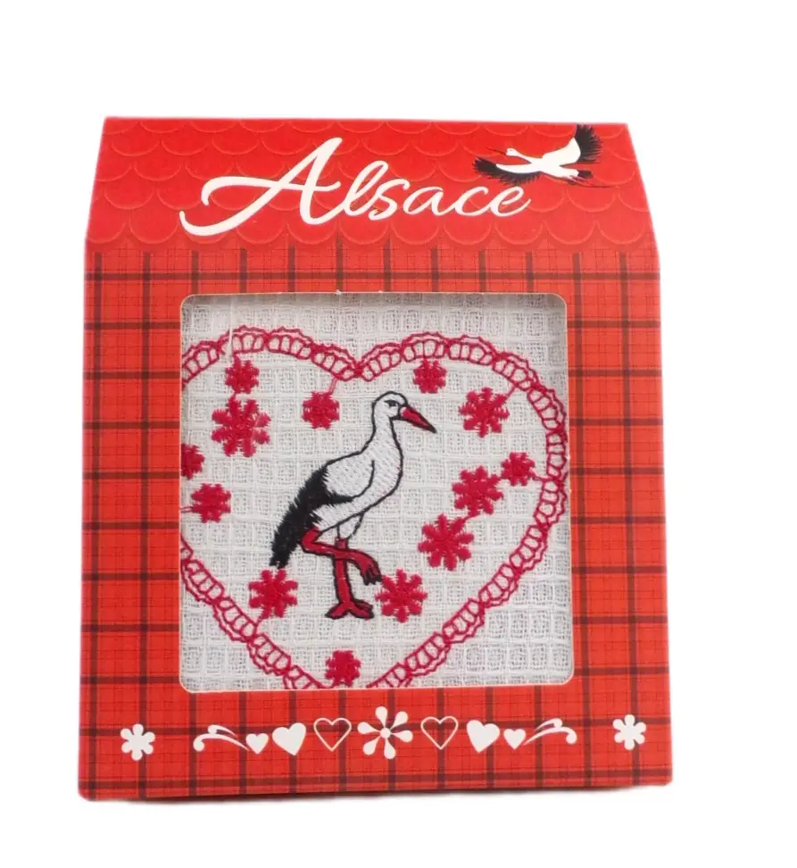 Coffret torchon cigogne brodé, cœur rouge, maisonnette Alsace. Cadeau authentique et déco régionale de qualité.