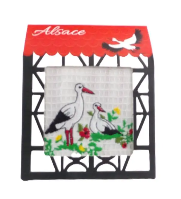 Offrez un souvenir typique et plein de charme d’Alsace avec cette jolie boîte en forme de maison à colombages traditionnelle. Ce coffret contient un torchon nid d’abeille (80 % coton, 20 % polyester) de dimensions 45 x 65 cm, brodé d’un motif emblématique : d’un couple de cigognes, symboles de l’Alsace, posées au milieu d’un décor fleuri.