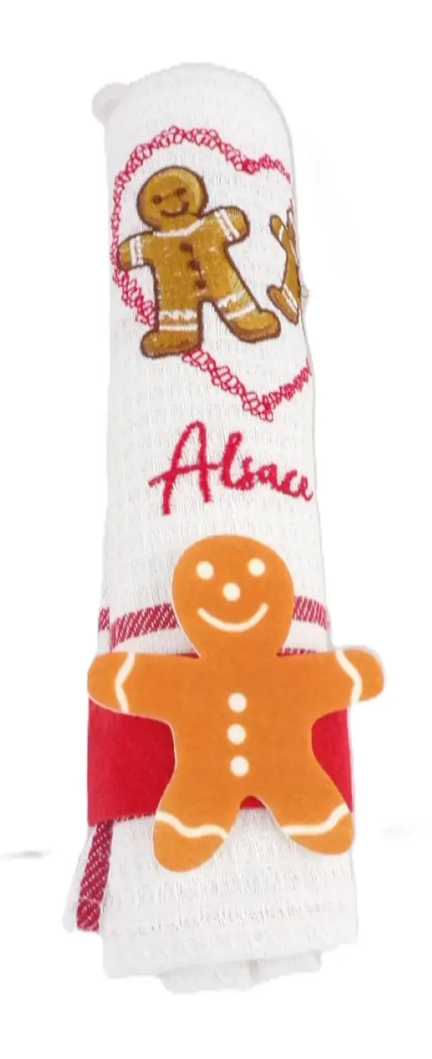 Torchon « Alsace » brodé pain d’épices, 80% coton, roulé avec rond de serviette décor pain d’épices. Idéal cadeau ou déco festive et alsacienne !